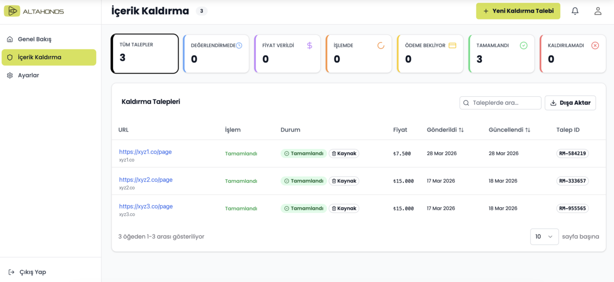 Tüm kaldırma taleplerinizi tek bir panelden takip edin. Her adımı şeffaf bir şekilde izleyin.